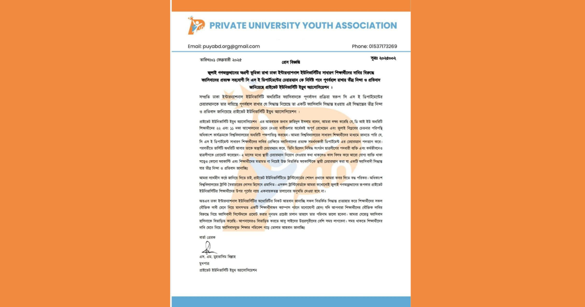 জুলাই গণঅভ্যুত্থানের অগ্রণী ভূমিকা রাখা ঢাকা ইন্টারন্যাশনাল ইউনিভার্সিটির সাধারণ শিক্ষার্থীদের দাবির বিরুদ্ধে ফ্যাসিবাদের প্রত্যক্ষ সহযোগী সি এস ই ডিপার্টমেন্টের চেয়ারম্যান কে নির্দিষ্ট পদে পূণর্বহাল রাখায় তীব্র নিন্দা ও প্রতিবাদ জানিয়েছে প্রাইভেট ইউনিভার্সিটি ইয়ুথ অ্যাসোসিয়েশন । সংগঠনটির মুখপাত্র এস.এম. মুহতাসিম বিল্লাহ স্বাক্ষরিত এক বিবৃতিতে তাঁরা এ তীব্র নিন্দা জানায়।